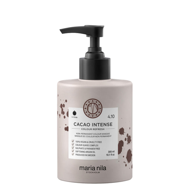 La Mascarilla de Color Cacao Intense de Maria Nila es un tratamiento capilar que combina pigmentos de color no permanentes con ingredientes nutritivos para revitalizar e intensificar los tonos castaños oscuros del cabello. Esta mascarilla no solo aporta un color vibrante, sino que también hidrata y fortalece el cabello, dejándolo suave y brillante. El color se mantiene entre 4 y 10 lavados, dependiendo del estado y la porosidad del cabello.
