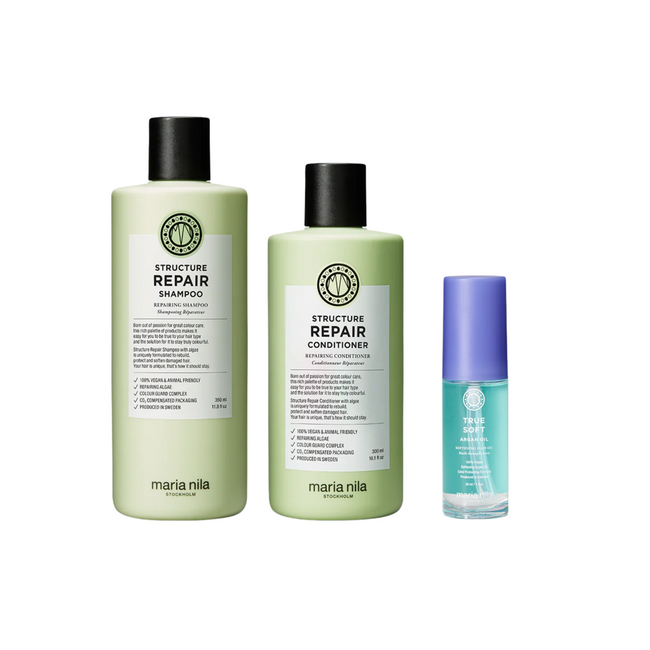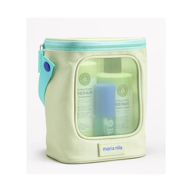 El pack Structure Repair de María Nila es una rutina de rescate intensiva para cabellos débiles, dañados o tratados químicamente. Presentado en un neceser verde pastel de edición limitada, este set combina el poder reparador de su champú y acondicionador con el aceite capilar True Soft para devolver al cabello su fuerza, suavidad y vitalidad natural.