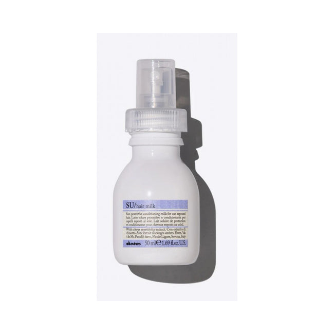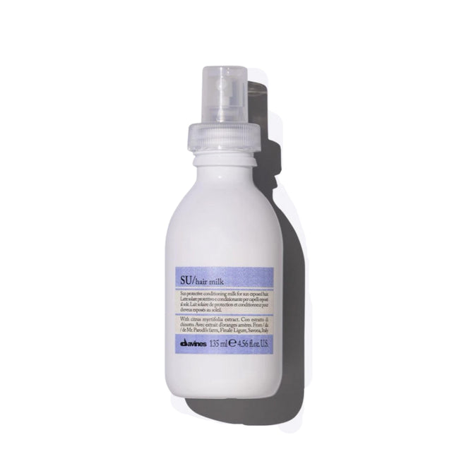 El SU Hair Milk de Davines es una leche capilar sin enjuague enriquecida con filtros UV protectores, diseñada para proteger el color cosmético y mantener la hidratación durante la exposición al sol. Este spray acondicionador ligero nutre y suaviza el cabello sin apelmazarlo, dejándolo suave, ligero y fácil de peinar.