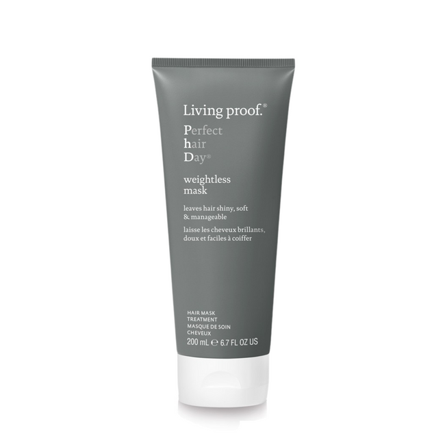 La Perfect Hair Day (PhD) Weightless Hydrating Mask de Living Proof es una mascarilla sin siliconas diseñada para revitalizar el cabello apagado, seco o sin vida, proporcionando hidratación, suavidad y brillo en solo cinco minutos. Su fórmula ligera es ideal incluso para cabellos finos o delgados, ya que no aporta peso adicional.